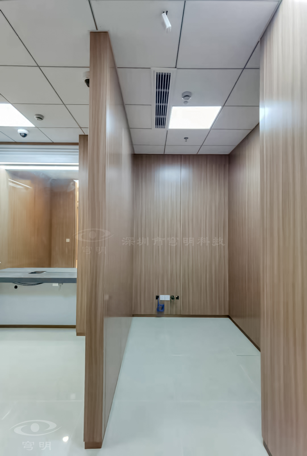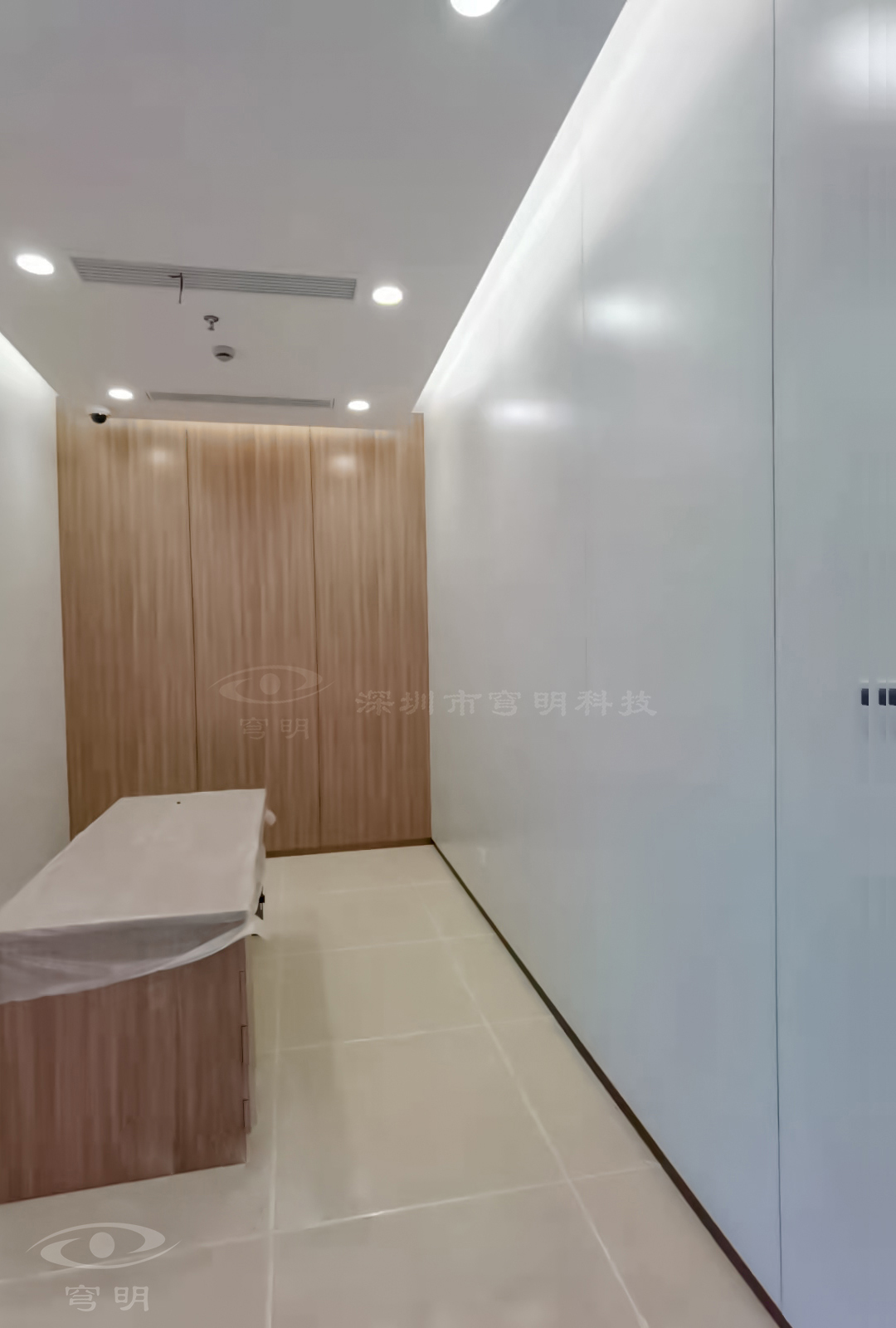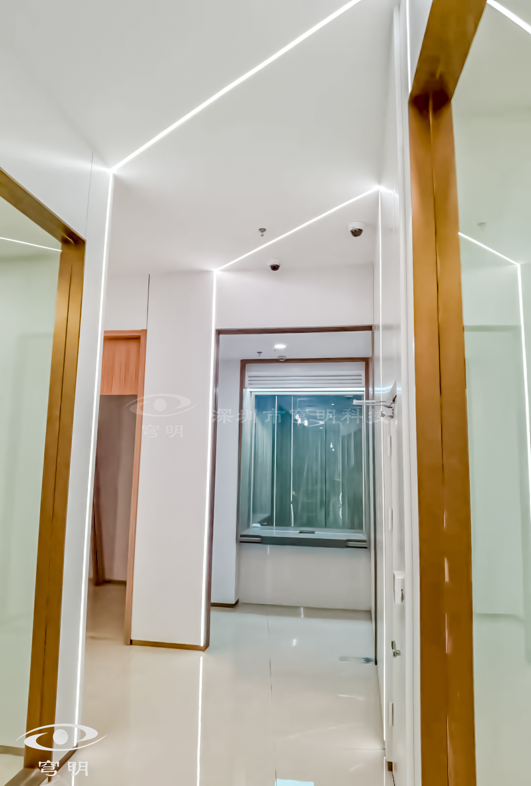 行政走廊以鏡面、陶瓷地板與sy849白色、紅豆杉木紋金屬復合板的碰撞融合,玻璃構成空間的多維度,使觀者置身其中,產生時尚簡約的共鳴。