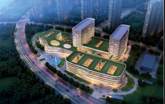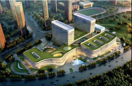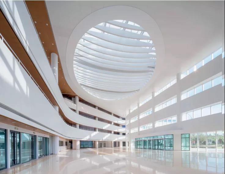 由于院區用地呈不規則的梭形,且用地處于西側城市主要交通與東側居住區的過渡區域,方案創新性地引入“城市客廳”的設計理念,用地中心位置的開敞共享公共大廳不僅作為與城市、居住區進行空間對話的形象節點,而且將整個院區各功能自然地整合在一起。